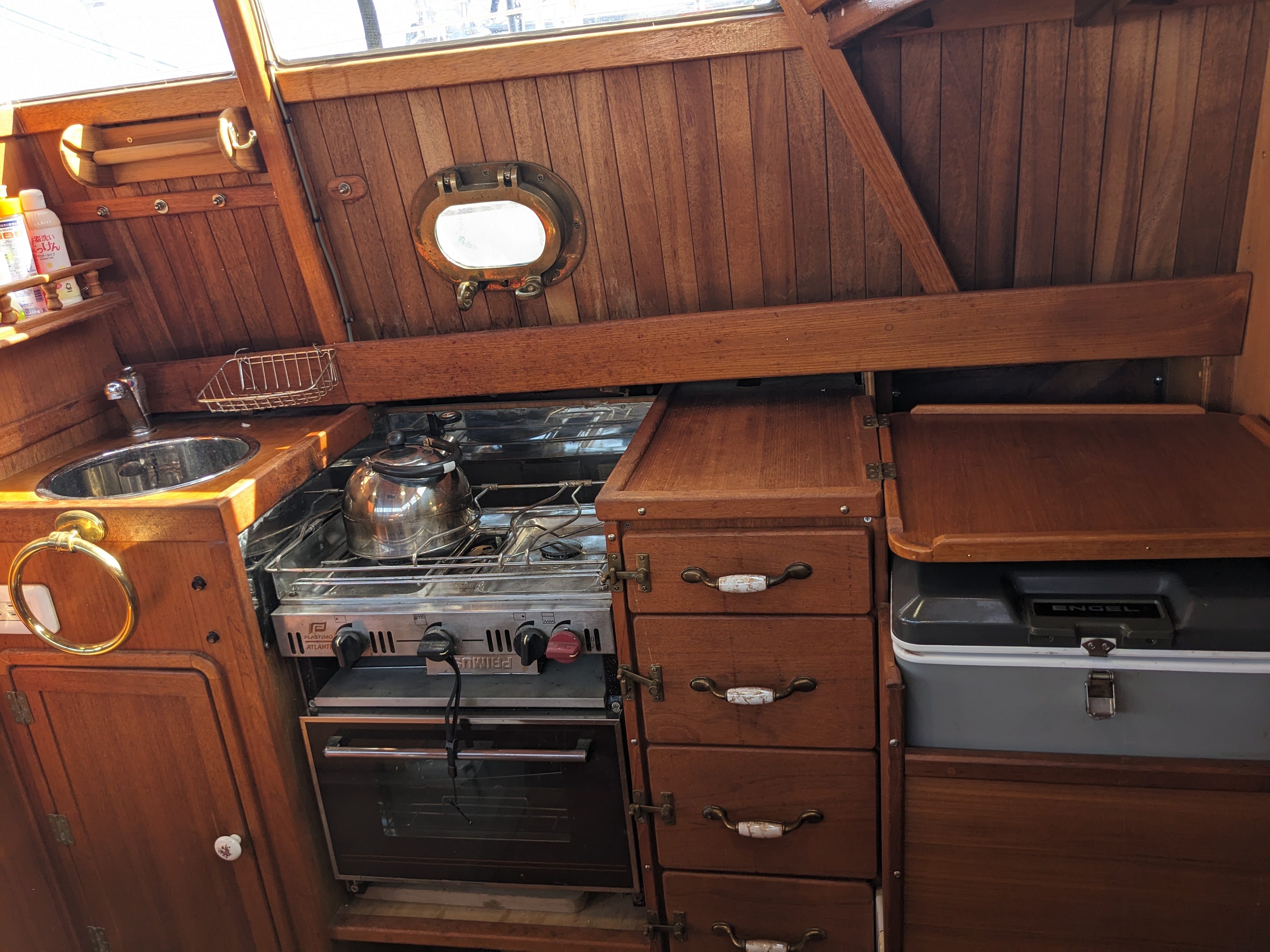 左舷はギャレーになっていて、オーブン付き2口コンロ(カセットボンベ式) シンクは丸方深シンクで、温水混合栓